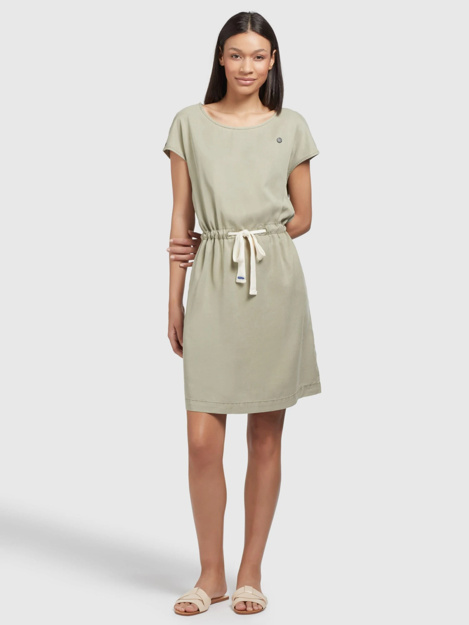 UnifarbenLyocellNormaler TrägerRundhals-AusschnittDrapiert/gerafftBund mit TunnelzugGerader SchnittSeitliche EingrifftaschenLabel PlateTon-in-Ton-NähteWeicher Griff